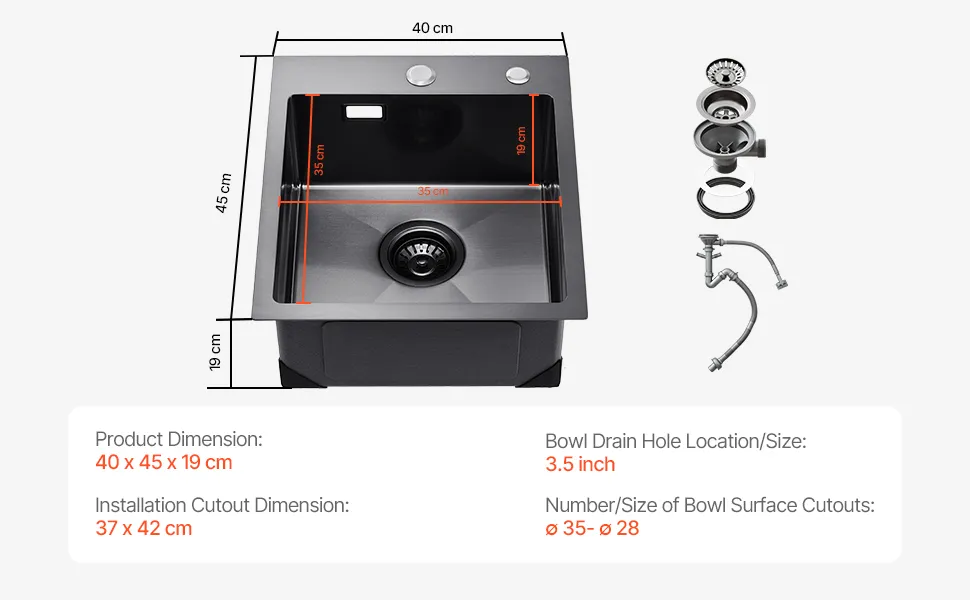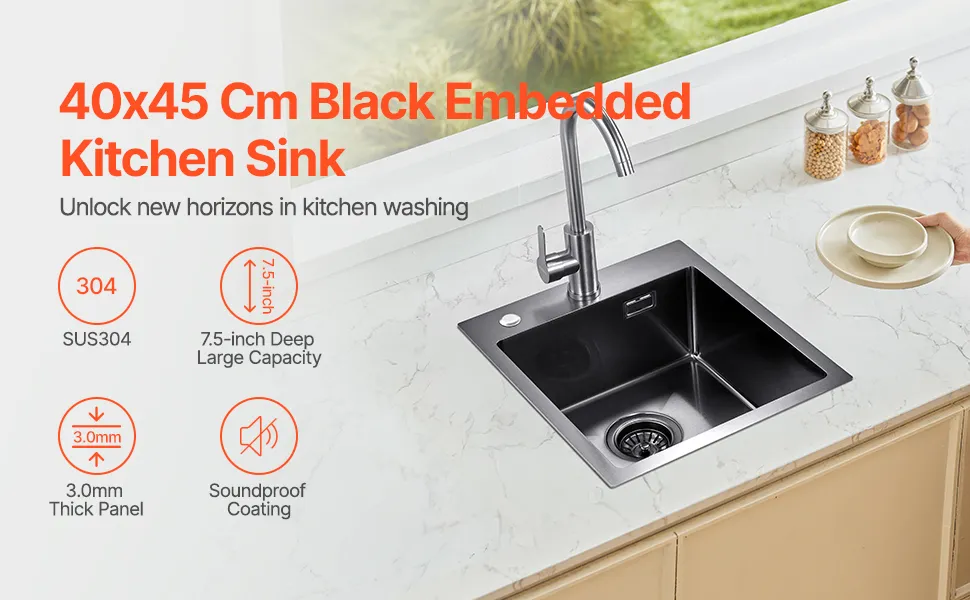 Großes Fassungsvermögen: Außenmaß der Spüle: 40 x 45 cm. Innenmaß: 37 x 42 cm. Beckentiefe: 19 cm. Dieses Einbauwaschbecken für die Küche ist tief genug für Tassen, Töpfe und Backbleche und erfüllt verschiedene Spülanforderungen.