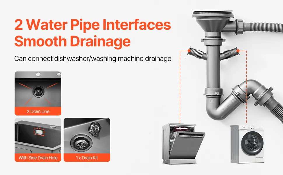 Schnelles Entleerungssystem: Diese Barspüle verfügt über ein X-förmiges Abflussdesign an der Unterseite, das mit einem Abflussset ausgestattet ist, um eine schnelle Entleerung zu gewährleisten und Wasseransammlungen zu verhindern. Es verfügt außerdem über eine seitliche Abflussöffnung und zwei Wasserrohrschnittstellen zum Anschluss von Geschirrspülern, die eine reibungslose Entleerung ohne Ansammlung von Speiseresten ermöglichen.
