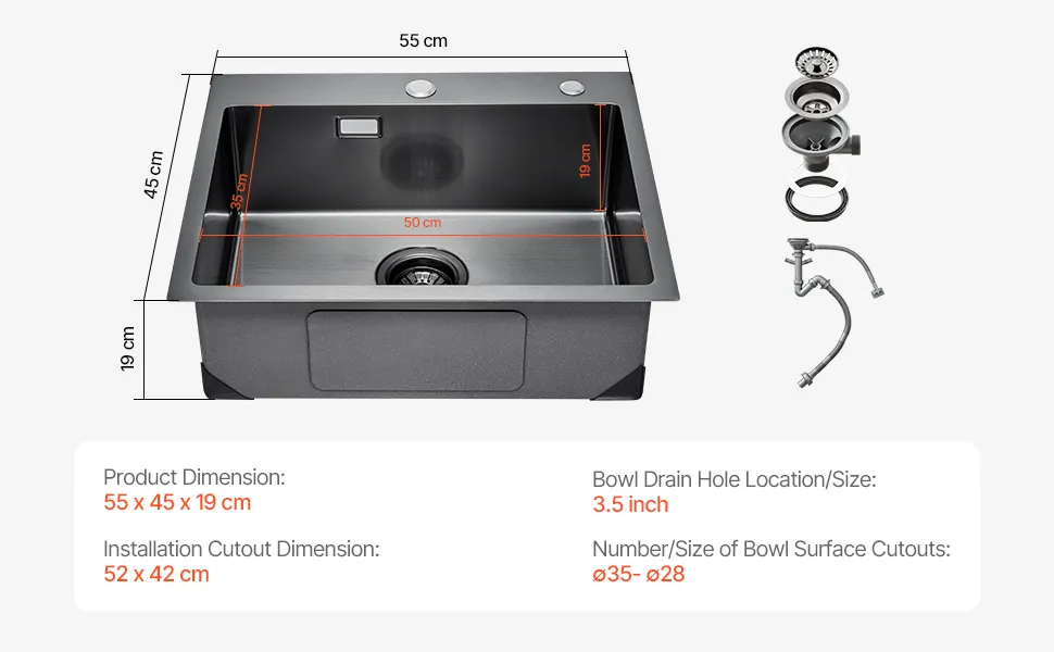 Großes Fassungsvermögen: Außenmaß der Spüle: 55 x 45 cm. Innenmaß: 52 x 42 cm. Beckentiefe: 19 cm. Dieses Einbauwaschbecken für die Küche ist tief genug für Tassen, Töpfe und Backbleche und erfüllt verschiedene Spülanforderungen.