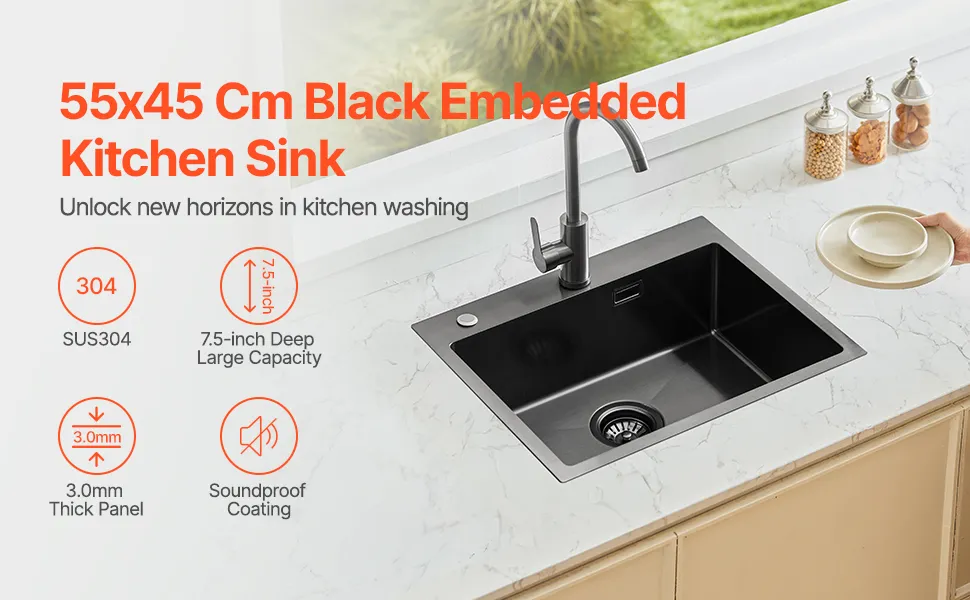 VEVOR Küchenspüle Einbauspüle Spülbecken 55 x 45 x 19 cm aus Edelstahl Spülen zur Montage auf der Oberseite, Einzelbecke Haushaltsspülbecken für Wohnmobil Vorbereitungsküche (schwarz)