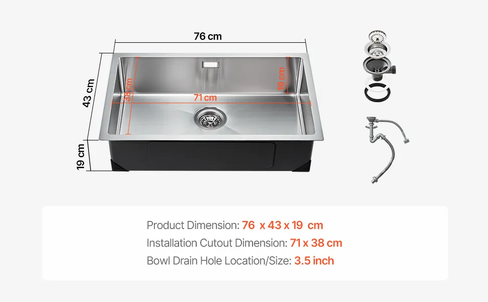 Außenmaß: 76 x 43 cm. Innenmaß: 71 x 38 cm. Die zusätzliche Tiefe von 19 cm ist perfekt zum Spülen von großem Kochgeschirr. Bitte bestätigen Sie vor dem Kauf, dass es auf Ihre Küchenarbeitsplatte passt.