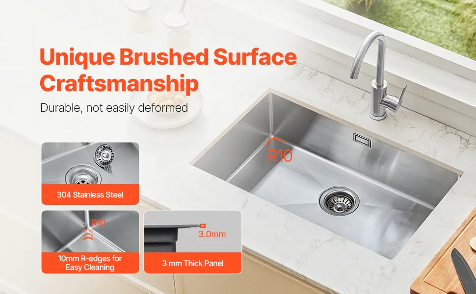 Robuster Edelstahl: Diese Küchenspüle ist aus hochwertigem 304 Edelstahl gefertigt und garantiert so Langlebigkeit, Rostbeständigkeit und einfache Reinigung. Vermeiden Sie jedoch scharfe Gegenstände, um Kratzer auf der Oberfläche zu vermeiden. Die verbesserte Plattenstärke beträgt 3 mm, 50 % dicker als bei den meisten Standard-Küchenspülen. Sie verfügt über abgerundete R10°-Ecken für einfache Reinigung und eine moderne Ästhetik.