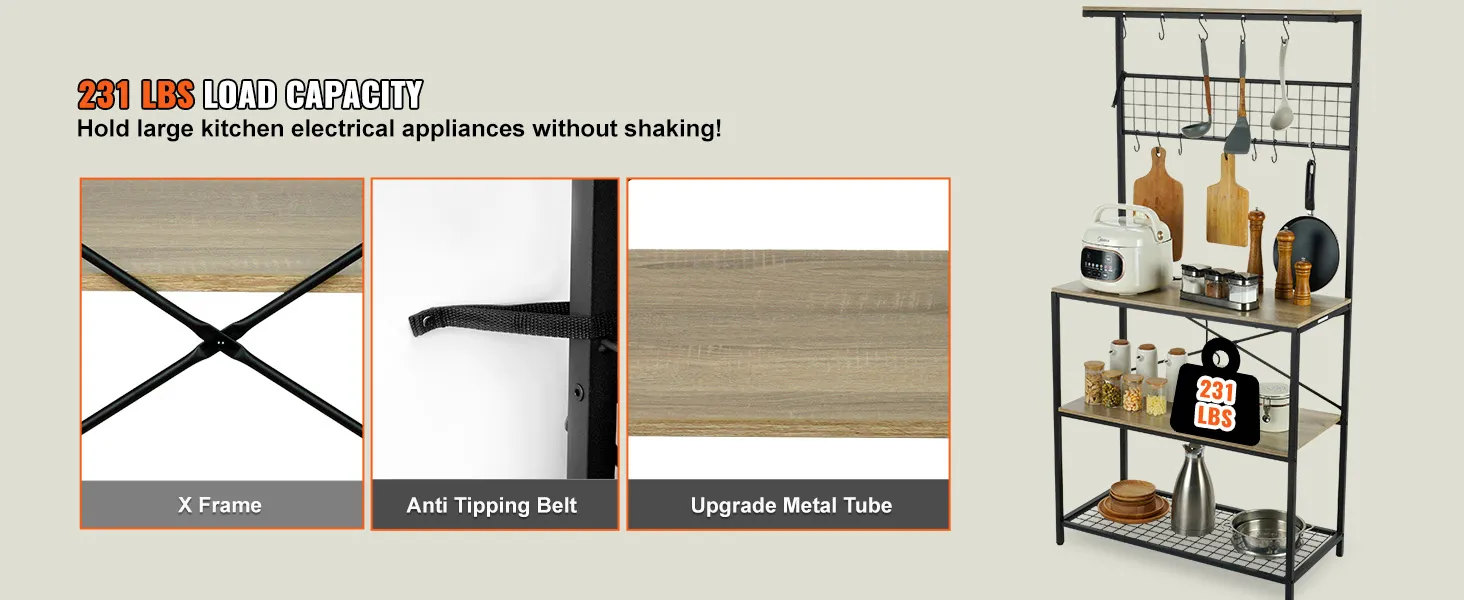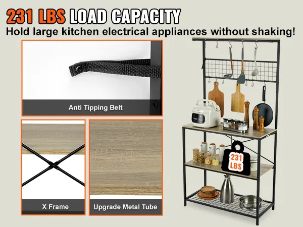Stabilität steht an erster Stelle: Das industrielle Backregal verwendet einen hochwertigen, verstärkten Rahmen, der es Ihnen ermöglicht, mehr von Ihren täglichen Notwendigkeiten zu tragen, ohne während der Benutzung zu wackeln oder zu kippen. Gesamttragfähigkeit: ca. 231 lbs (ca. 104,7 kg). Eine Tonne Unterstützung in der Küche ist ein Muss.