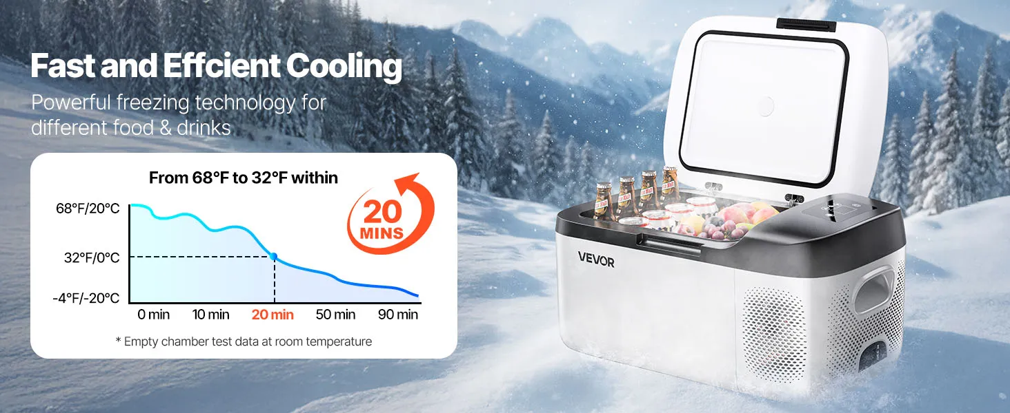 Kompressorkühlleistung: Dank Kompressorkühlung senkt die 12-V-Elektrokühlbox die Temperatur in ca. 25 Minuten von 20 °C (68 °F) auf 0 °C (32 °F) und hält so Lebensmittel unterwegs länger frisch. Der Energiesparmodus sorgt für effizientes Kühlen im Alltag, während der MAX-Modus unterwegs bei Bedarf für schnellere Kühlung sorgt