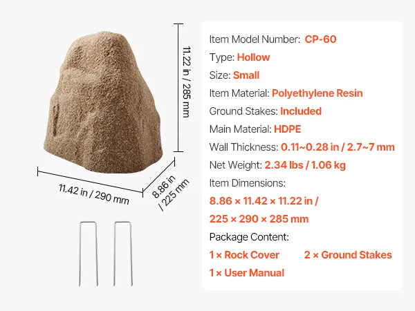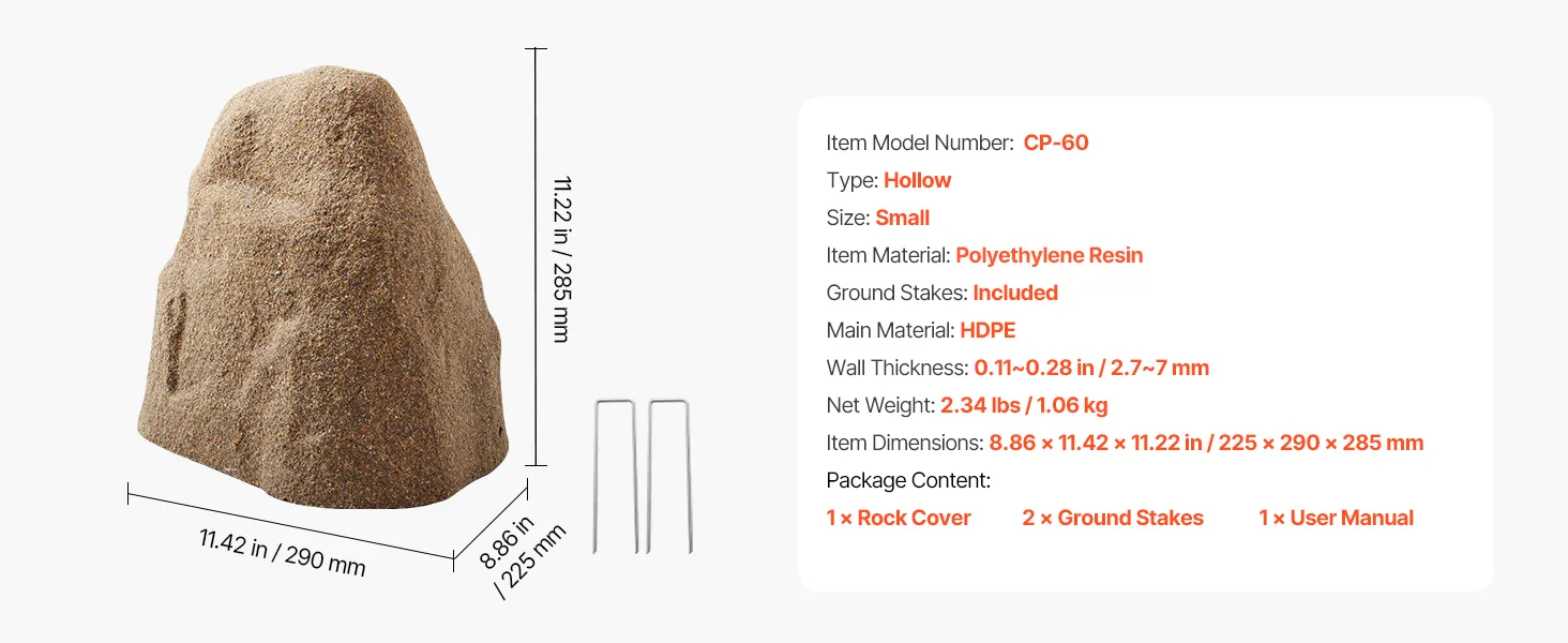 Kleine Größe für vielseitigen Einsatz: Mit den Maßen 225 x 290 x 285 mm verdeckt unsere Landschafts-Felsabdeckung gängige Einrichtungen wie Pumpen, Schaltkästen, Schachtabdeckungen und Sprinklerventile. Bitte messen Sie Ihre Anlage vor der Installation
