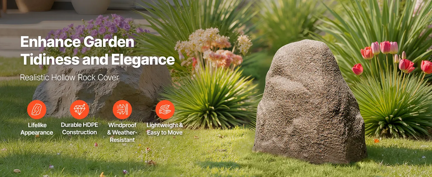 Windbeständiges und stabiles Design: Unsere Kunstfelsabdeckungen verfügen über Bodenlöcher und Metallpfähle zur einfachen Befestigung auf Gras oder Erde. Dieses Design verhindert windbedingte Verschiebungen und die Installation erfordert kein Werkzeug. Geeignet für Gärten und Terrassen