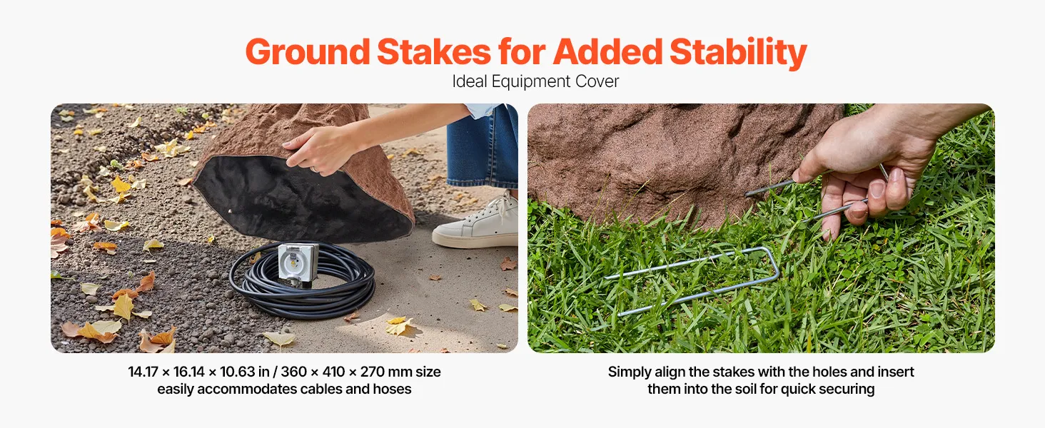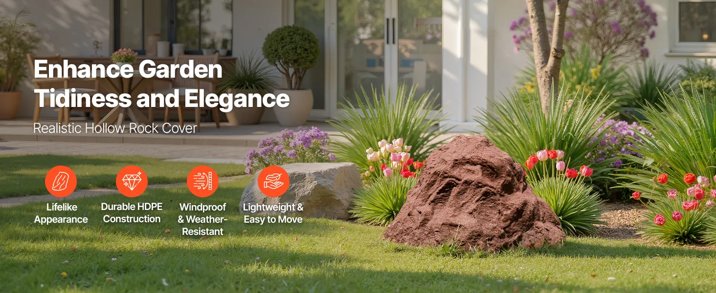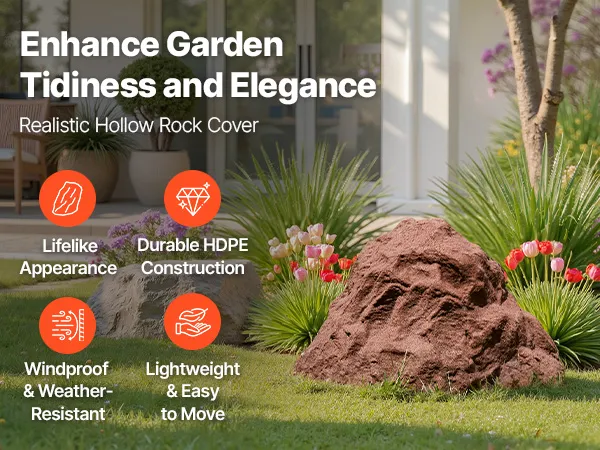 Windbeständiges und stabiles Design: Unsere Kunstfelsabdeckungen verfügen über Bodenlöcher und Metallpfähle zur einfachen Befestigung auf Gras oder Erde. Dieses Design verhindert windbedingte Verschiebungen und die Installation erfordert kein Werkzeug. Geeignet für Gärten und Terrassen