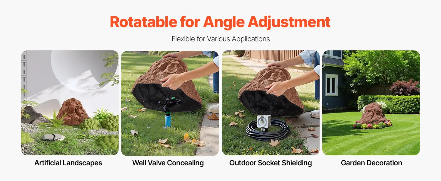 Der Winkel lässt sich flexibel drehen und an Ihre Bedürfnisse anpassen. Diese Landschafts-Steinabdeckung eignet sich ideal zum Abdecken von Schachtdeckeln, für kleine Pumpen, zum Abschirmen von Schaltkästen und als Gartendekoration. Das vielseitige Design macht sie praktisch und stilvoll.