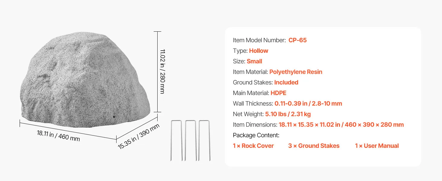 Kleine Größe für vielseitigen Einsatz: Mit den Maßen 460 x 390 x 280 mm verdeckt unser Gartenfelsen gängige Einrichtungen wie Pumpen, Schaltkästen, Schachtabdeckungen und Sprinklerventile. Bitte messen Sie Ihre Anlage vor der Installation