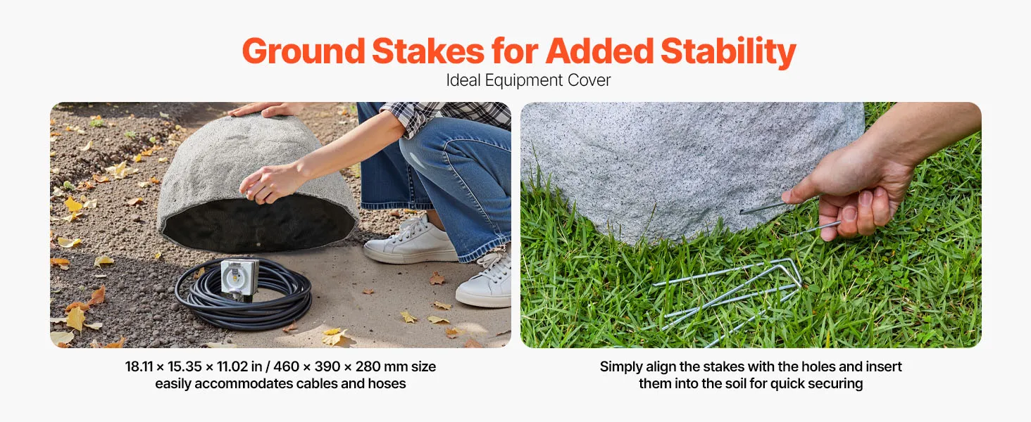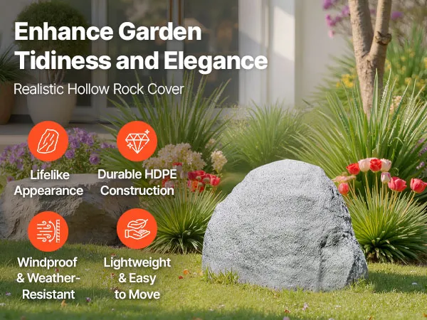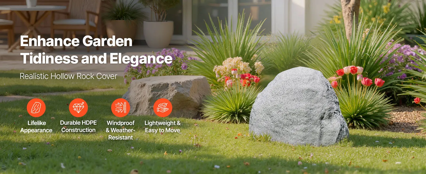 Windbeständiges und stabiles Design: Unsere Kunstfelsabdeckungen verfügen über Bodenlöcher und Metallpfähle zur einfachen Befestigung auf Gras oder Erde. Dieses Design verhindert windbedingte Verschiebungen und die Installation erfordert kein Werkzeug. Geeignet für Gärten und Terrassen