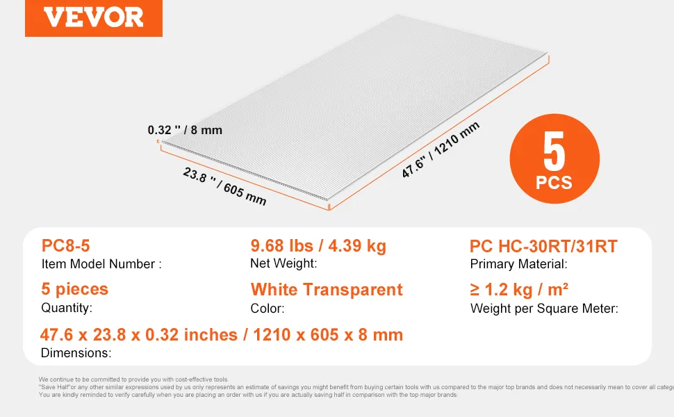 VEVOR 5er-Set Gewächshausplatten aus Polycarbonat, 1210 x 605 x 8 mm Stegplatten, wasserdichte UV-geschützte gewellte Hohlkammerplatten, schlagfeste, transparente Dachplatten für Gewächshaus/Garten
