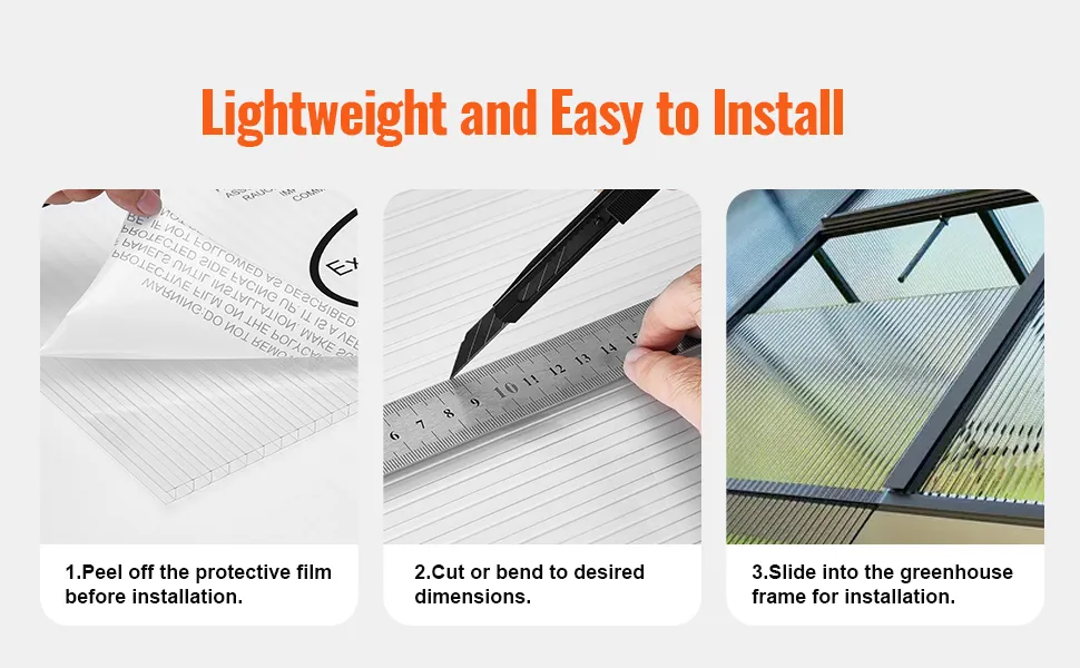 Hochtransparentes Polycarbonat mit UV-Schutz bietet reichlich Licht, blockiert UV-Strahlen und unterstützt das Pflanzenwachstum. Es ist einfach zu installieren, anpassungsfähig und energieeffizient und bietet das ganze Jahr über Isolierung und Sicherheit.