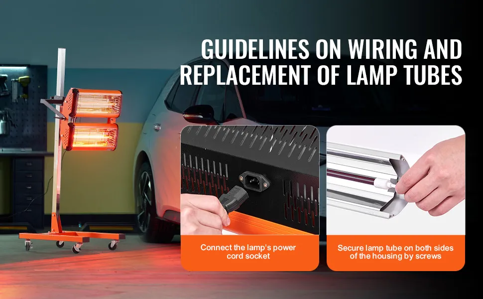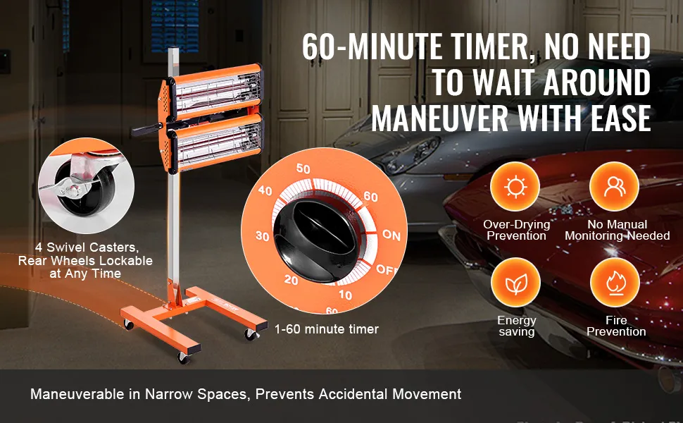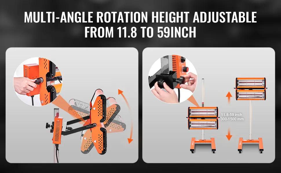 Einstellbarer Winkel & Höhe: Diese Farbtrocknerlampe verfügt über einen 60-Minuten-Smart-Timer, mit dem Sie Höhe und Winkel des Lampenkopfs frei einstellen können. Ausgestattet mit omnidirektionalen Rädern und feststellbaren Rollen löst sie Ihre Probleme mit Timing, Lampenkopfeinstellung und Mobilität während des Lackiervorgangs und sorgt für ein effizienteres Betriebserlebnis.