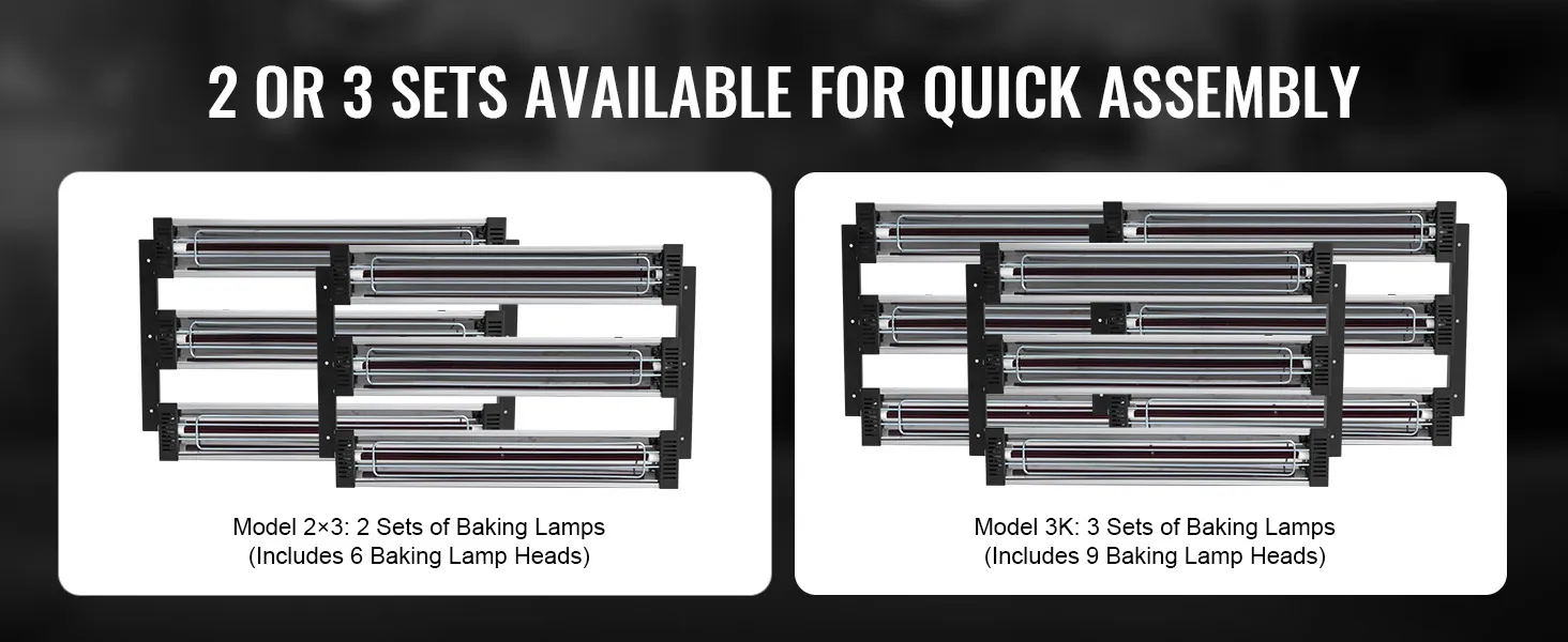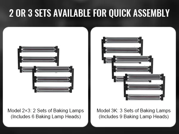 Wählen Sie zwischen 2- oder 3-Lampenkopf-Setups für eine optimale Trocknung. Jedes Set enthält 3 Köpfe und bietet so eine flexible Abdeckung und verbesserte Effizienz.
