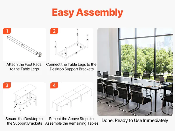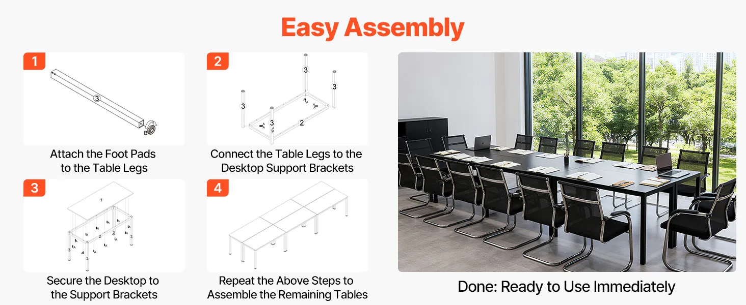 Einfache Montage: Unser Bürotisch wird mit einem kompletten Satz Schrauben, Schraubenschlüssel und Schraubendreher sowie einer ausführlichen Anleitung geliefert. Kein zusätzliches Werkzeug erforderlich, selbst Anfänger können schnell einen stabilen, langlebigen Konferenztisch zusammenbauen und so Zeit und Mühe sparen
