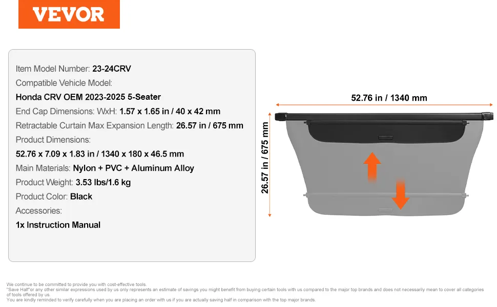 Die VEVOR-Kofferraumabdeckung für den Honda CRV 2023 ist perfekt auf die Modelle Honda CR-V 2023-2024 abgestimmt. Sie verbessert die Ästhetik Ihres Fahrzeugs. Die Abdeckung passt sich der Rundung des Kofferraums Ihres Autos an. Dies sorgt für einen sauberen und organisierten Raum. Darüber hinaus bietet das Design der Abdeckung ein elegantes Erscheinungsbild. Sie erhalten eine nahtlose Passform. Das verbessert das Gesamtbild aller Fahrzeuge. Durch die einfache Installation und Anpassung ist sie für alle Benutzer geeignet. Die Abdeckung sitzt eng und stellt sicher, dass zwischen der Abdeckung und der letzten Sitzreihe keine Lücke entsteht.