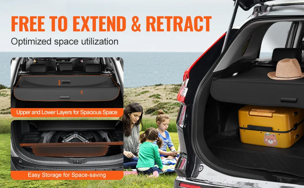 Flexibles einziehbares Design: Das einziehbare Design bietet Flexibilität, sodass Sie den Stauraum mühelos erweitern oder für einen offenen Laderaum einziehen können. Außerdem gibt es keine Lücke zwischen der Gepäckraumabdeckung und der letzten Sitzreihe, sodass Sie sich keine Sorgen machen müssen, dass Gegenstände während der Fahrt von der Gepäckraumabdeckung fallen.