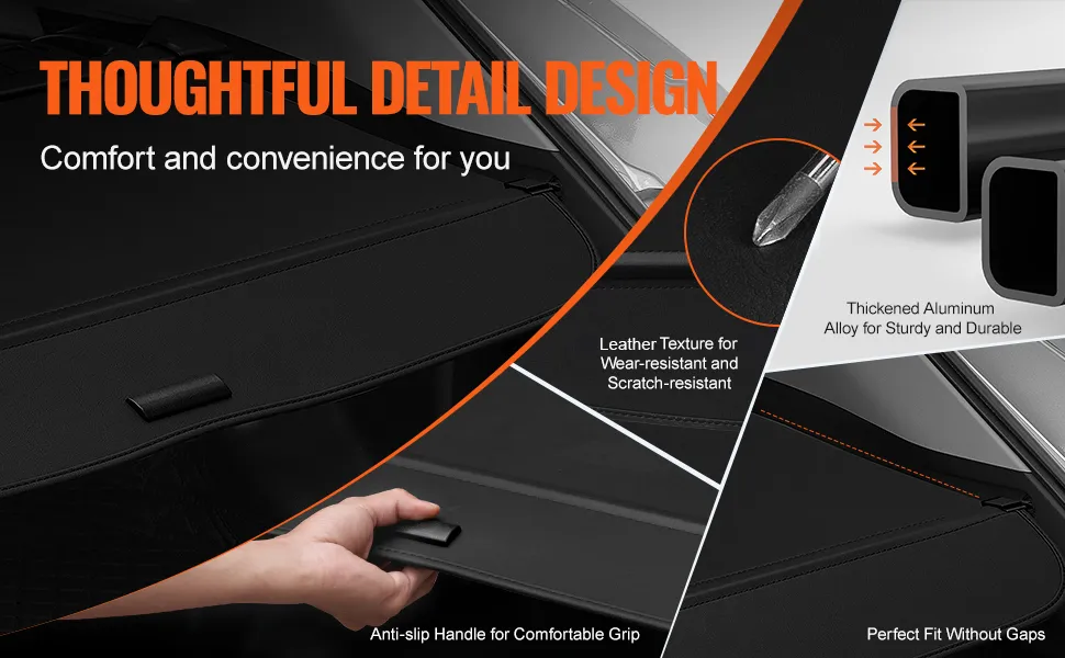 Der Hauptkörper der einziehbaren Laderaumabdeckung besteht aus einer verdickten Aluminiumlegierung für erhöhte Haltbarkeit, einem rutschfesten Griffdesign für bequemen Halt und einer Oberfläche mit Lederstruktur, die verschleißfest und kratzfest ist.
