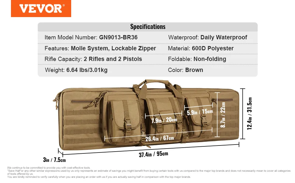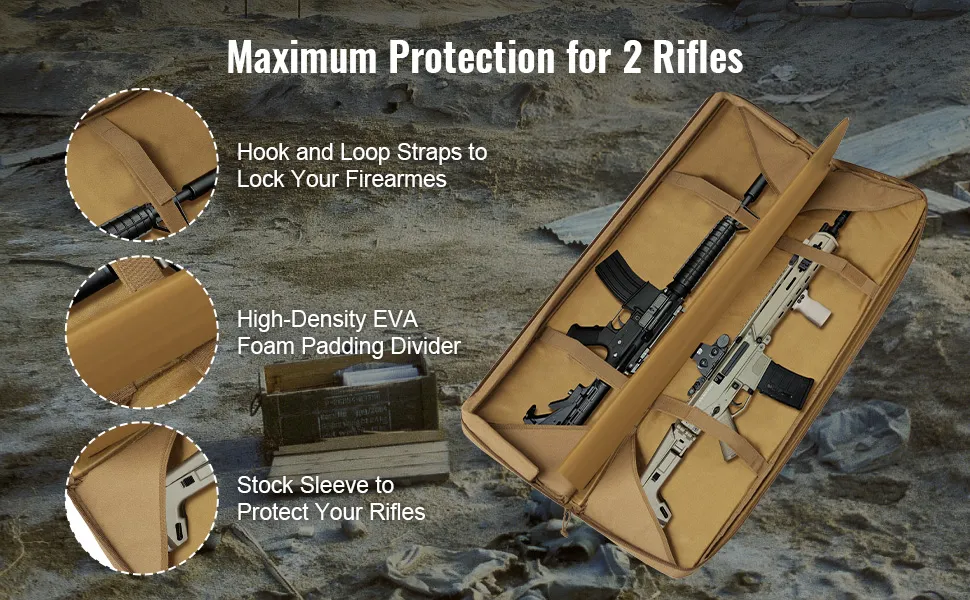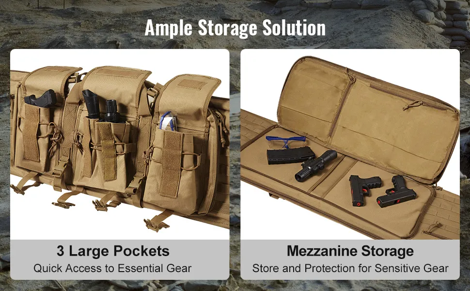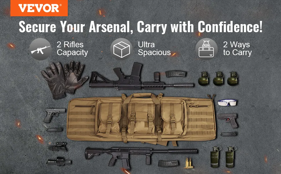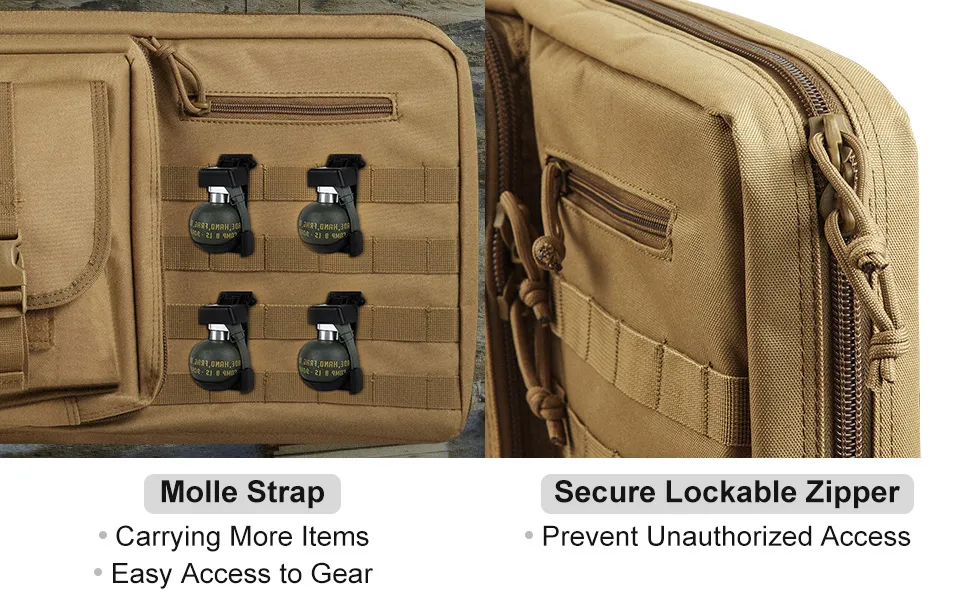 VEVOR legt bei dieser taktischen Tasche höchsten Wert auf höchste Qualität. Sie verfügt über abschließbare Reißverschlüsse, um Ihre Schusswaffen sicher aufzubewahren. Diese wichtige Funktion verhindert unbefugten Zugriff. Sie können Ihre Waffen und Munition ohne Bedenken sicher aufbewahren. Die abschließbaren Reißverschlüsse bieten eine zusätzliche Schutzschicht. Eines der wichtigsten Dinge beim Reisen oder Aufbewahren der Tasche ist, dass sie dafür sorgt, dass Ihre Ausrüstung jederzeit sicher und geschützt bleibt. Die VEVOR-Tasche gibt verantwortungsbewussten Waffenbesitzern ein beruhigendes Gefühl.