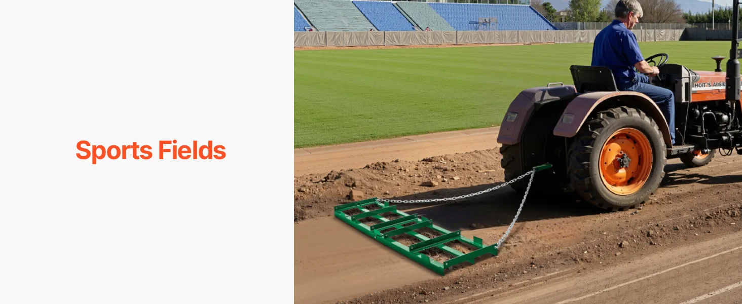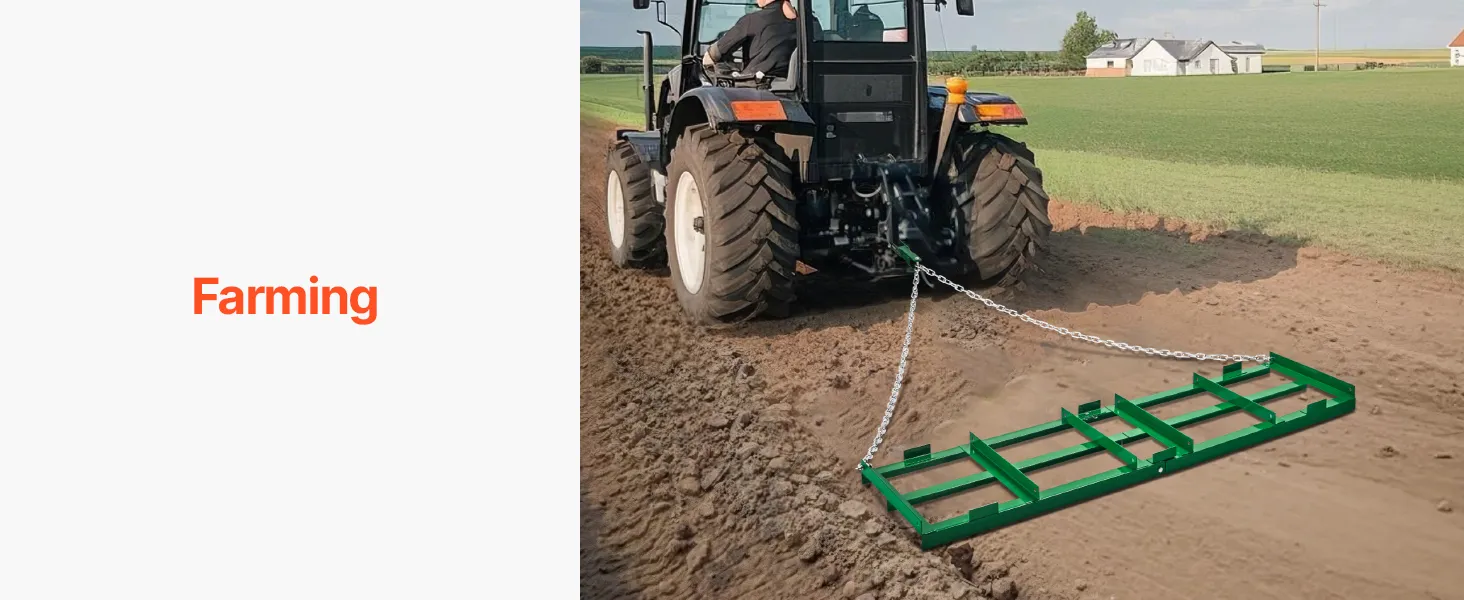 Vielseitige Anwendungen: Dieser Schleppeggenrechen eignet sich ideal zum Einebnen von Erde, Gras, Sand und Kies. Er ist das ideale Werkzeug zum Einebnen von Feldern, Einfahrten, Parkplätzen und mehr und ermöglicht effiziente und problemlose Landbewirtschaftungsaufgaben.
