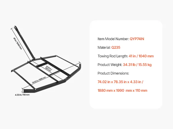 Die Zugstange ermöglicht reibungsloses und einfaches Wenden. Mit einer Anhängekupplungsbreite von 4,5 cm ist diese Schleppegge kompatibel mit Geländefahrzeugen, UTVs, Gartentraktoren und mehr – ganz ohne zusätzliches Werkzeug. Sie lässt sich schnell ankuppeln und bietet hervorragenden Arbeitskomfort.