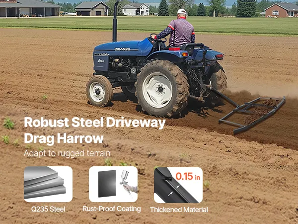 Dieser Schleppeggenrechen besteht aus hochfestem Q235-Stahl und verfügt über eine rostbeständige Beschichtung. Er bewältigt harte Aufgaben bei jedem Wetter und gewährleistet jahrelang zuverlässige Leistung.