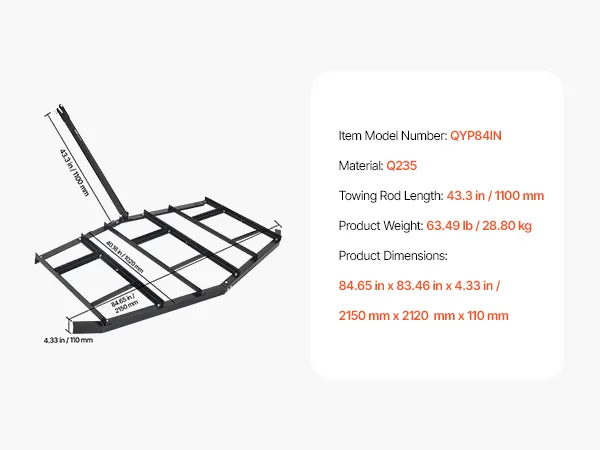 Die Zugstange ermöglicht reibungsloses und einfaches Wenden. Mit einer Anhängekupplungsbreite von 4,5 cm ist diese Schleppegge kompatibel mit ATVs, UTVs, Gartentraktoren und mehr – ganz ohne zusätzliches Werkzeug. Sie lässt sich schnell ankuppeln und bietet hervorragenden Arbeitskomfort.