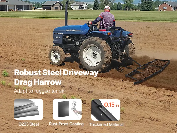 Robuste Haltbarkeit: Unsere Schleppegge ist aus Q235-Stahl gefertigt und somit biege- und verformungsbeständig. Die rostbeständige schwarze Pulverbeschichtung sorgt für Langlebigkeit auch in rauen Umgebungen und macht sie zu einem zuverlässigen Partner für jedes anspruchsvolle Gelände. So sind Ihre landwirtschaftlichen Aufgaben stets einsatzbereit.