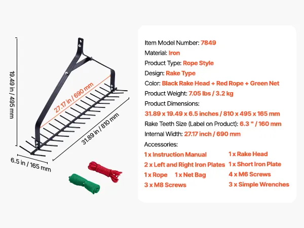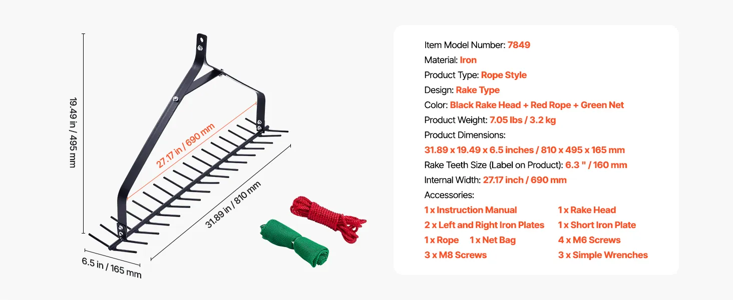 Der aus hochfestem Eisen gefertigte Wasserpflanzenrechen wird mit einem 9 Meter langen Nylonseil und einem Nylonnetzbeutel geliefert und erleichtert so das Entfernen von schwimmendem Unkraut. Robuste Zinken und eine verstärkte Struktur sorgen für Langlebigkeit und effiziente Unkrautentfernung. Komplettes Zubehör, einfache Montage.