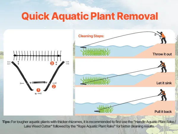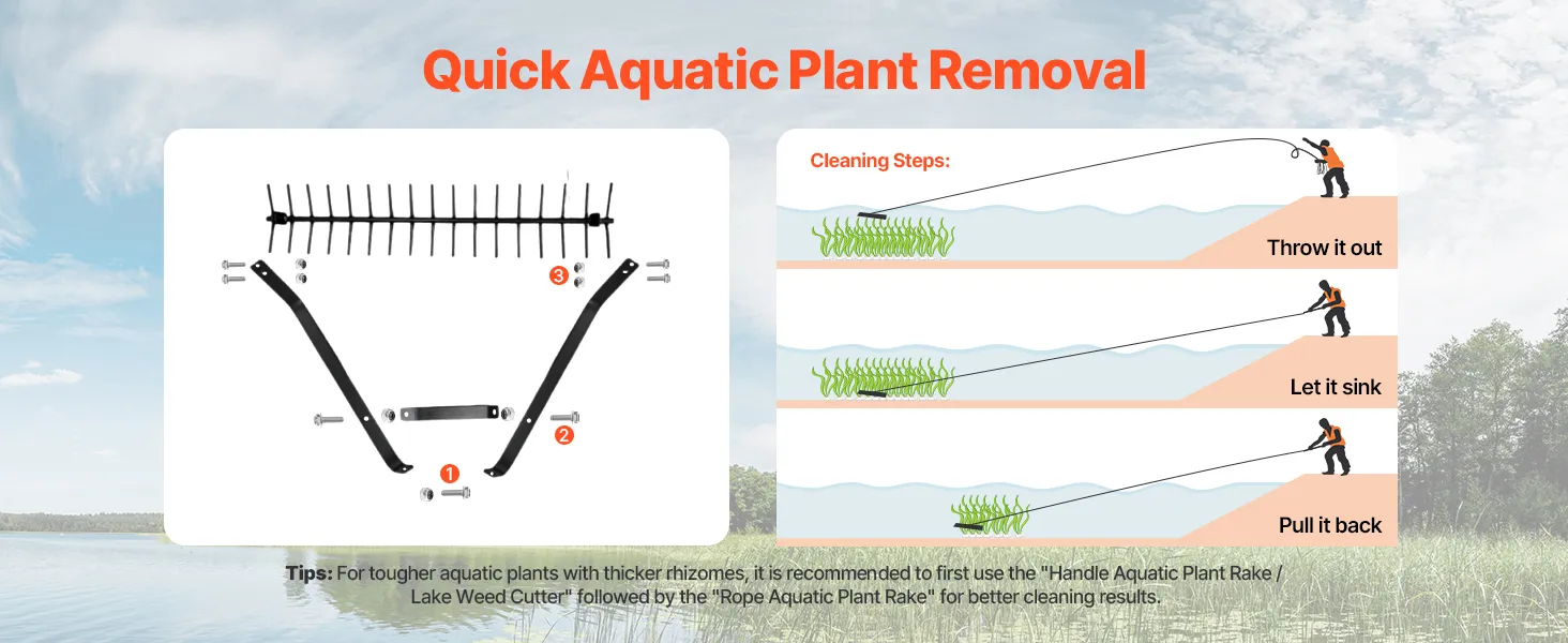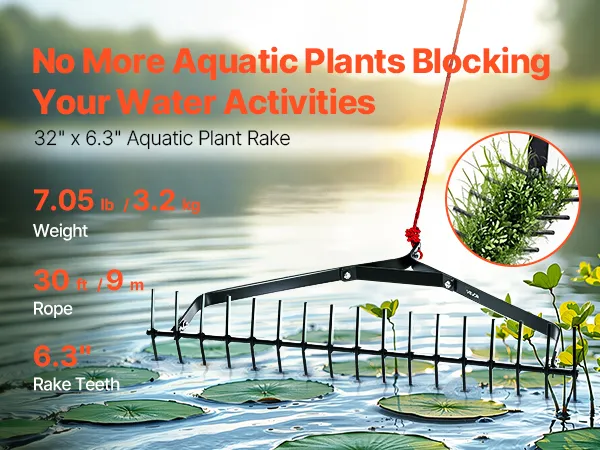 Anwendungsszenarien: Dieser Seerechen für Unkraut eignet sich ideal zum Entfernen von Wasserpflanzen in Seen, Teichen und Bächen. Besonders effektiv bei nicht wurzelnden Unkräutern wie Tausendblatt, Chara, Seidenmoos, Wasserlappen und Baumwollmoos.