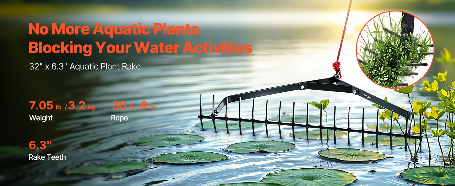 VEVOR Teichrechen 810x495x165 m, doppelseitiger Unkrautentfernungswerkzeug aus Eisen, leichter Teichpflanzenschneider mit 9 m Seil, kein Zusammenbau erforderlich, für Teich, See, Bach