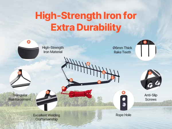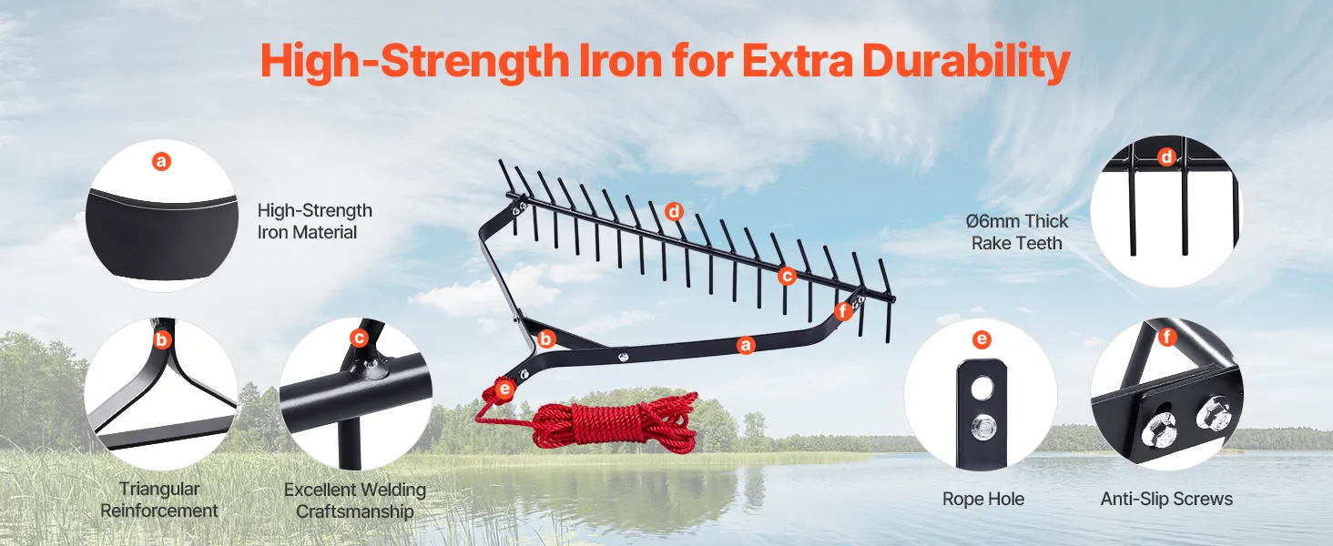 Hochfestes, langlebiges Material: Dieser aus hochfestem Eisen gefertigte Unkrautrechen bleibt auch nach längerem Einsatz im Wasser robust und langlebig. Dreieckige Verstärkungen und rutschfeste Schrauben sowie hervorragende Schweißverarbeitung sorgen für Stabilität und Sicherheit während des Gebrauchs.