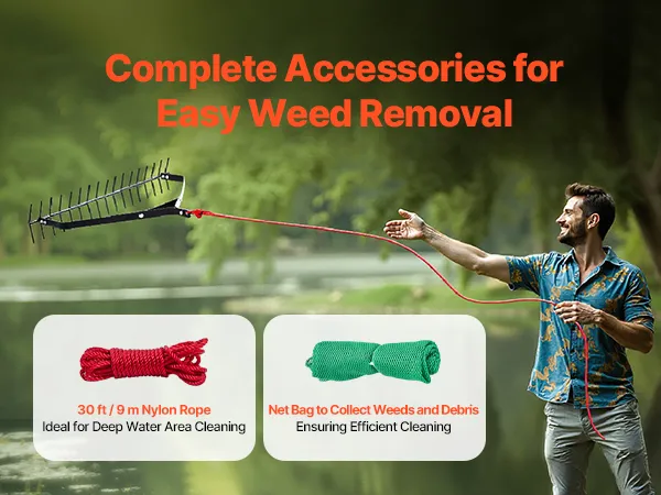 Leichtgewicht: Dieser Teichrechen wiegt nur 3,2 kg und wird mit einem 9 m langen Nylonseil geliefert, sodass große Flächen problemlos bearbeitet werden können. Werfen Sie den Teichrechen einfach, lassen Sie ihn sinken und rollen Sie ihn wieder ein, um das Unkraut zu entfernen. Er ist einfach zu bedienen und sorgt für ein problemloses Reinigungserlebnis.