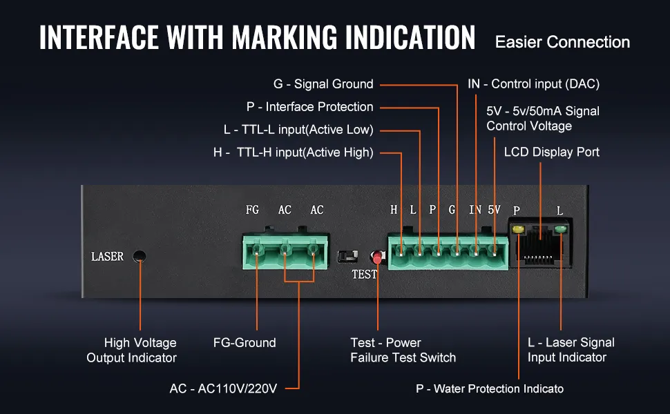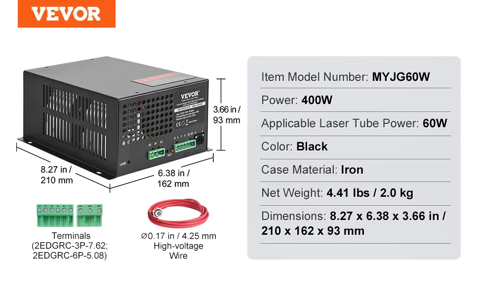Kompatibel mit 60-W-Laserröhre: Das speziell für Lasergravurmaschinen hergestellte Lasernetzteil ist perfekt mit 60-W-Laserröhren verschiedener Marken kompatibel. Die Anschlüsse sind deutlich mit entsprechenden Etiketten gekennzeichnet, Sie können die Verbindung problemlos gemäß den Richtlinien herstellen.