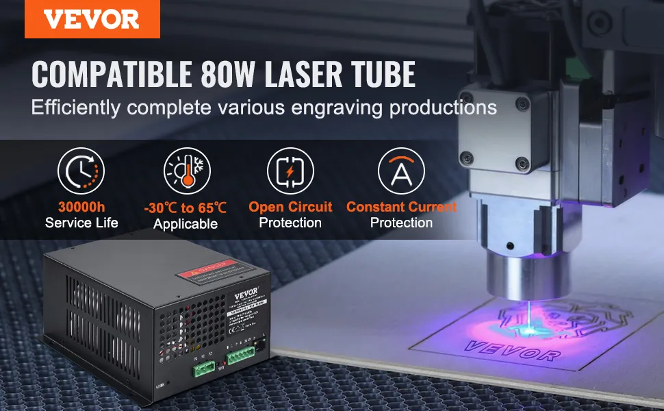 VEVOR CO2-Laser-Netzteil, 80-W-Laserröhren-Netzteil, Konstantstrom- und Leerlaufschutz, schnelle Wärmeableitung, Power Supply kompatibel mit Lasergravierern und -schneidern