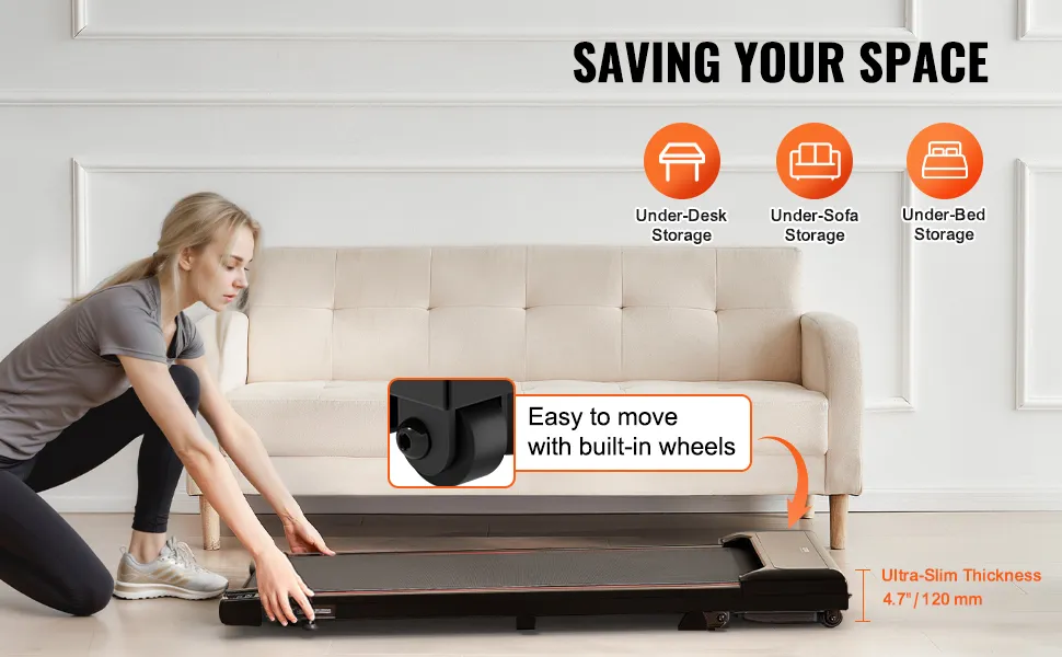 Ultraschlank & platzsparend: Das kompakte Design erleichtert die Aufbewahrung und den Transport dieses Lauf- und Jogginggeräts. Mit einer schlanken Dicke von 4,7 Zoll (120 mm) passt es problemlos unter ein Sofa, Bett usw. Dank der integrierten Räder können Sie es bei Bedarf mühelos bewegen. Installationsfreies Design, sofort einsatzbereit.