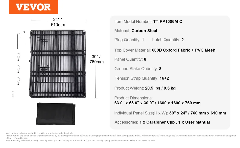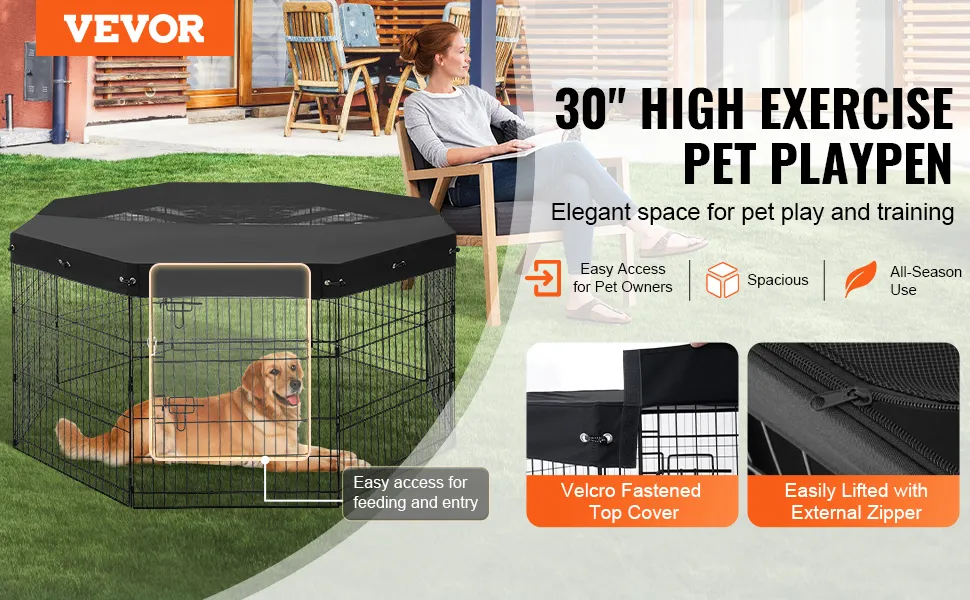 Vielseitig einsetzbar: Dieser Laufstall für Hunde besteht aus 8 Paneelen, die zu einem Achteck mit einer Kantenlänge von 24 Zoll / 610 mm angeordnet werden können und so einen geräumigen Bereich für Haustiere bieten. Die Tür lässt sich ganz nach oben öffnen, während die obere Abdeckung mit einem Reißverschluss geöffnet werden kann, damit der Besitzer leichter darauf zugreifen kann.