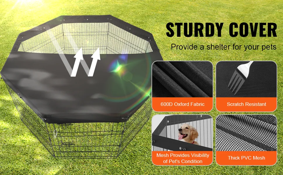 Wasserdichte und langlebige Oberabdeckung: Die Oberabdeckung unseres Laufstalls besteht zur Hälfte aus strapazierfähigem 600D Oxford-Gewebe und zur Hälfte aus verstärktem PVC-Netzgewebe, das kratzfest, leicht zu reinigen und sonnenbeständig ist. Es verhindert, dass Haustiere herausspringen, und sorgt gleichzeitig für Belüftung und Lichteinfall, um ein Gefühl der Enge zu vermeiden.