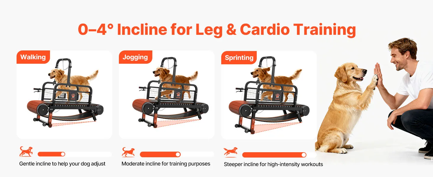 Einfach verstellbar und individuell anpassbar: Die obere Leinenhalterung, die Querstange, die Beinhöhe, die Neigung und der Widerstand sind alle verstellbar, sodass sich dieses Hundelaufgerät leicht an verschiedene Hunde und Trainingsniveaus anpassen lässt. Der Verzicht auf Motoren bedeutet weniger Wartungsaufwand und einen leiseren Betrieb