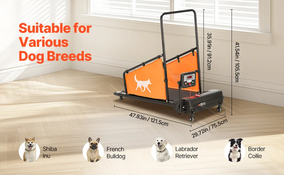 Ideal für kleine bis mittelgroße Hunde: Mit den Maßen 121,5 x 75,5 x 105,5 cm (47,83 x 29,72 x 41,54 Zoll) und einer Lauffläche von 36 cm (14,17 Zoll) ist dieses Laufband für Haustiere für Hunde mit einem Gewicht von bis zu 200 Pfund und einer Größe von 23,6 Zoll geeignet, darunter Rassen wie Shiba Inu, Labrador und Französische Bulldoggen