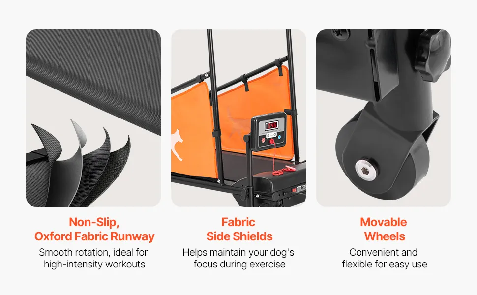 Sicheres und langlebiges Design: Ausgestattet mit einem robusten Rahmen aus Karbonstahl für Stabilität, einer rutschfesten 4-lagigen Oxford-Stoffbahn zum Schutz der Pfoten Ihres Hundes und Seitenteilen, die für Konzentration und Sicherheit sorgen. Ausgestattet mit Rädern für bequeme Mobilität