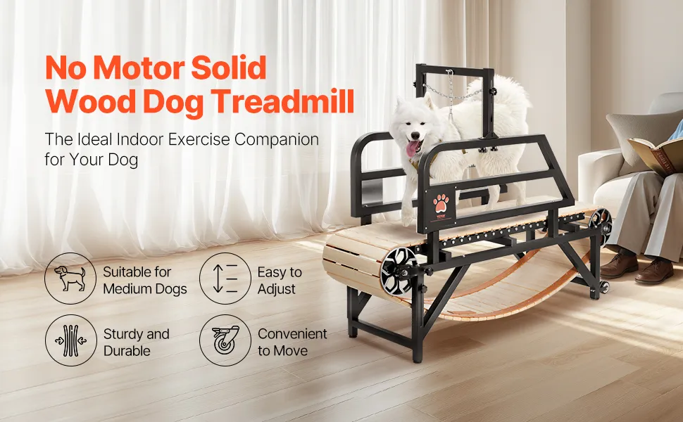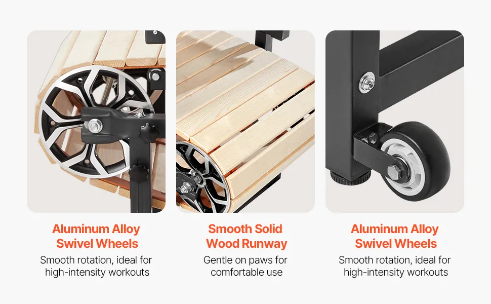 Dieses Hundelaufband aus Karbonstahl mit Holzlauffläche und Aluminiumrollen bietet ein komfortables Training ohne Strom. Zu den Funktionen gehören eine verstellbare Leinenbefestigung und Neigungseinstellungen, wodurch es sich ideal für mittelgroße bis große Hunde bis zu 100 kg eignet.