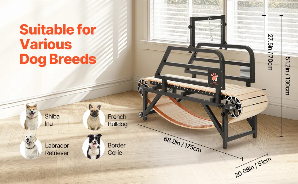 Stabile und langlebige Konstruktion: Unser Hundelaufgerät verfügt über einen robusten Rahmen aus Karbonstahl für Stabilität und eine glatte Holzbahn, die die Pfoten Ihres Hundes nicht verletzt. Die Aluminiumrollen sorgen für Sicherheit bei intensivem Training und zwei Räder ermöglichen eine einfache Bewegung.