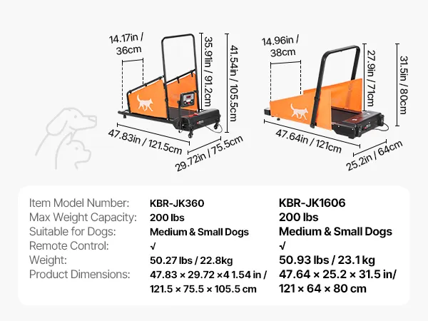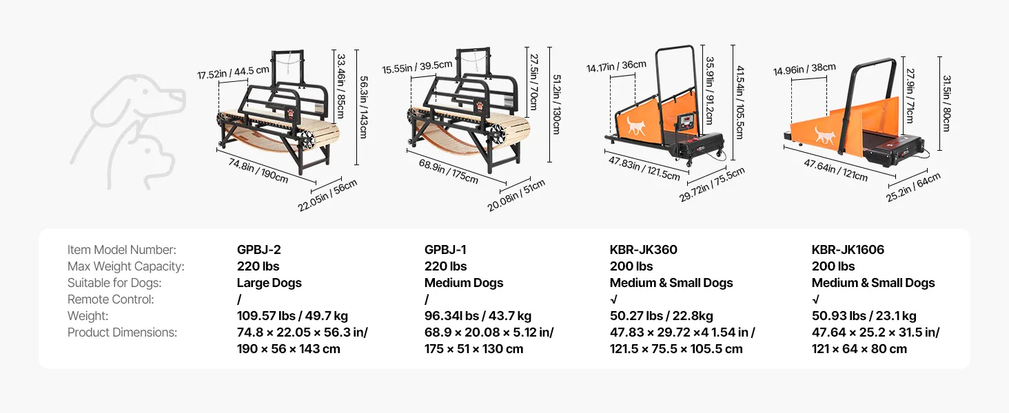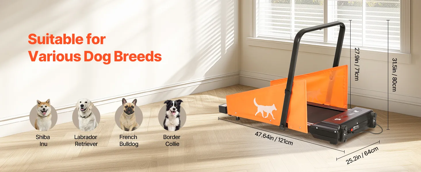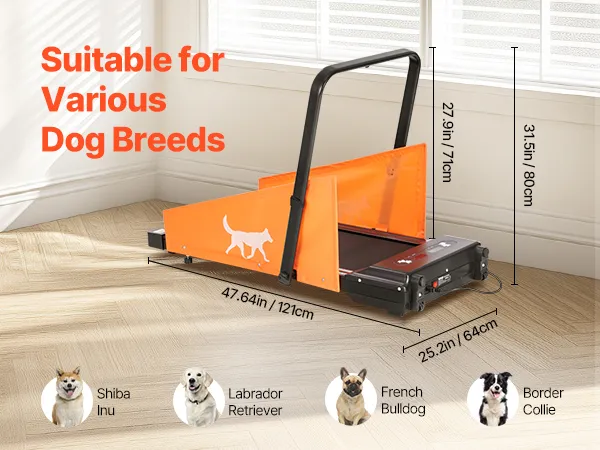 Ideal für kleine bis mittelgroße Hunde: Abmessungen: 121 x 64 x 80 cm (47,64 x 25,2 x 31,5 Zoll) mit einer 38 cm (14,96 Zoll) breiten Laufbahn. Dieses Hundelaufgerät ist für Hunde mit einem Gewicht von bis zu 200 lbs (90 kg) und einer Größe von 23,6 Zoll (60 cm) geeignet, darunter Rassen wie Shiba Inu, Labrador und Französische Bulldoggen.