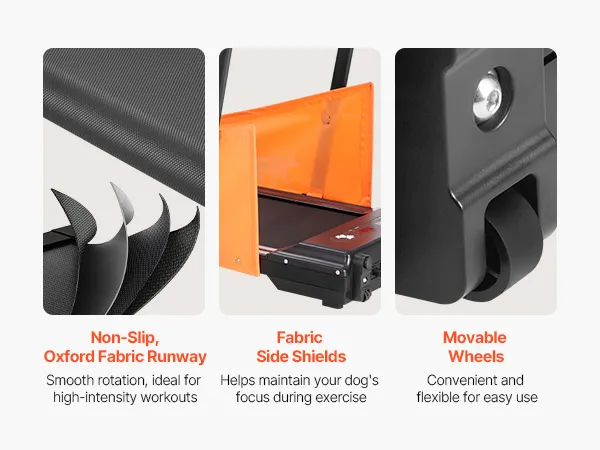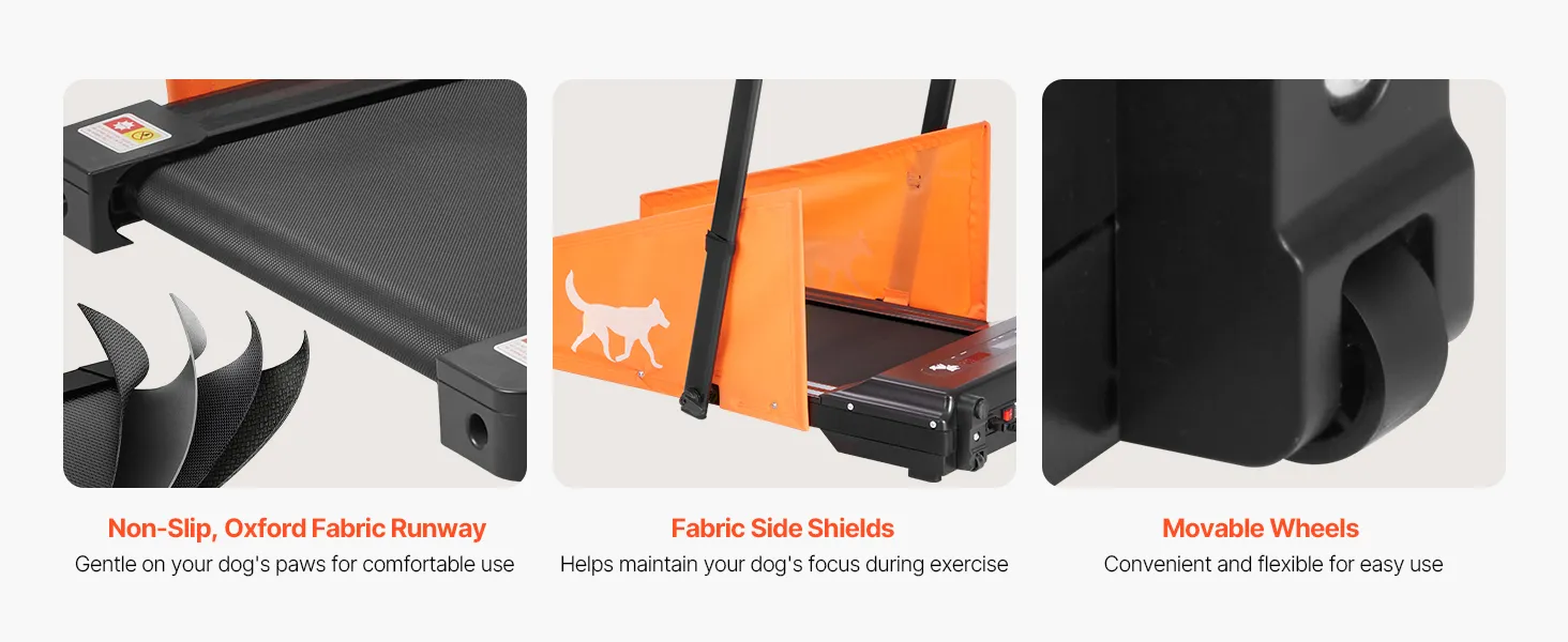 Sichere und langlebige Konstruktion: Das Laufband für Hundetraining verfügt über einen robusten Rahmen aus Karbonstahl für Stabilität und eine rutschfeste Lauffläche aus 4-lagigem Oxford-Stoff zum Schutz der Pfoten Ihres Hundes. Die seitlichen Stoffpaneele helfen dabei, die Konzentration zu behalten und bieten zusätzliche Sicherheit, während zwei Räder eine einfache Bewegung ermöglichen.