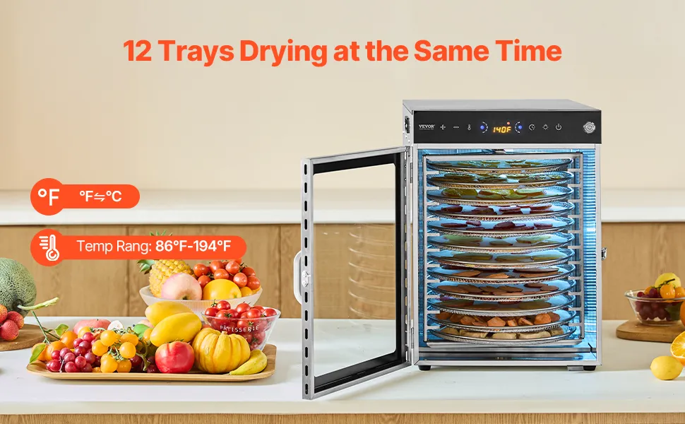 12-lagiges großes Fassungsvermögen: Dieser große Dörrapparat kann bis zu zwölf Lagen Lebensmittel gleichzeitig aufnehmen und trocknet große Mengen an Zutaten auf einmal. Steuerung mit einer intelligenten Digitalanzeige, einstellbar von 86 ℉ bis 194 ℉ (30 ℃ bis 90 ℃), und ein 24-Stunden-Smart-Timer machen eine manuelle Überwachung überflüssig. Perfekt zum Dörren verschiedener Früchte, Gemüse, Trockenfleisch, Kräuter, Tees und Meeresfrüchte