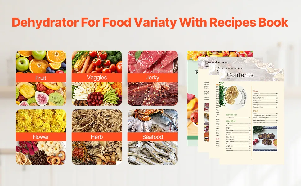 Der große Dörrautomat mit 12 Etagen eignet sich hervorragend zum Trocknen verschiedener Zutaten wie Obst, Getreide etc. Im Lieferumfang ist ein Rezept enthalten, mit dem Sie ganz einfach verschiedene gesunde und selbstgemachte Trockenprodukte zubereiten können.
