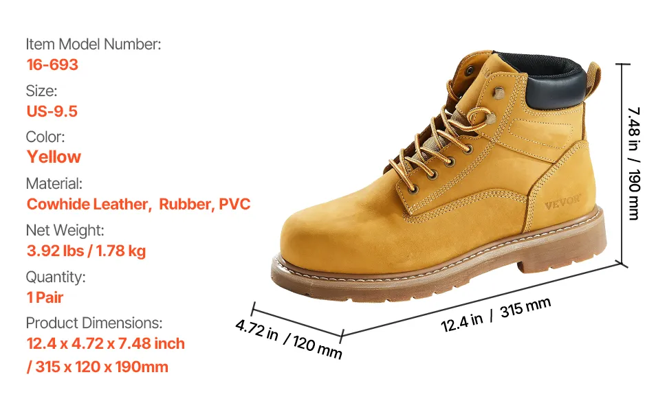 VEVOR Arbeitsstiefel mit Stahlkappe, US-Größe 9,5, Arbeitsschuhe für Herren, Sicherheitsschuhe, leichte und atmungsaktive Gummisohle für Herrenstiefel für Industrie und Bau, Braun/Gelb