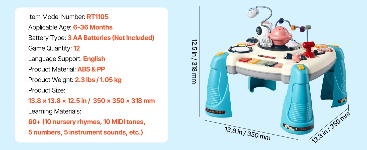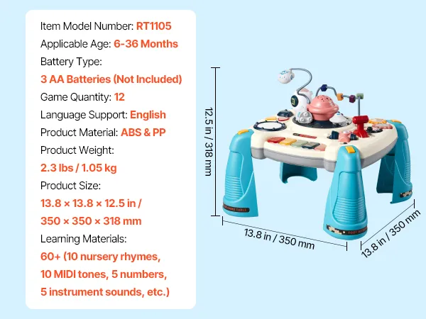 Dieser musikalische Lerntisch verfügt über verstärkte, ausklappbare Beine mit rutschfesten Füßen für sicheren Stand. Das robuste ABS-Gehäuse ist besonders elternfreundlich. Der Tisch wird mit 3 AA-Batterien (nicht im Lieferumfang enthalten) betrieben und sorgt so für Ordnung und kabellosen Spielbereich.