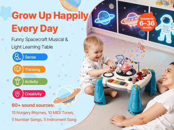 • Lernen für alle Sinne: Dieser Lerntisch im Weltraum-Design kombiniert Licht, Musik, verschiedene Texturen und lustige Effekte für Kinder ab 6 Monaten! Jede Berührung fördert die Feinmotorik, erste Sprachkenntnisse und die visuelle Wahrnehmung – wer hätte gedacht, dass Lernen so viel Spaß machen kann